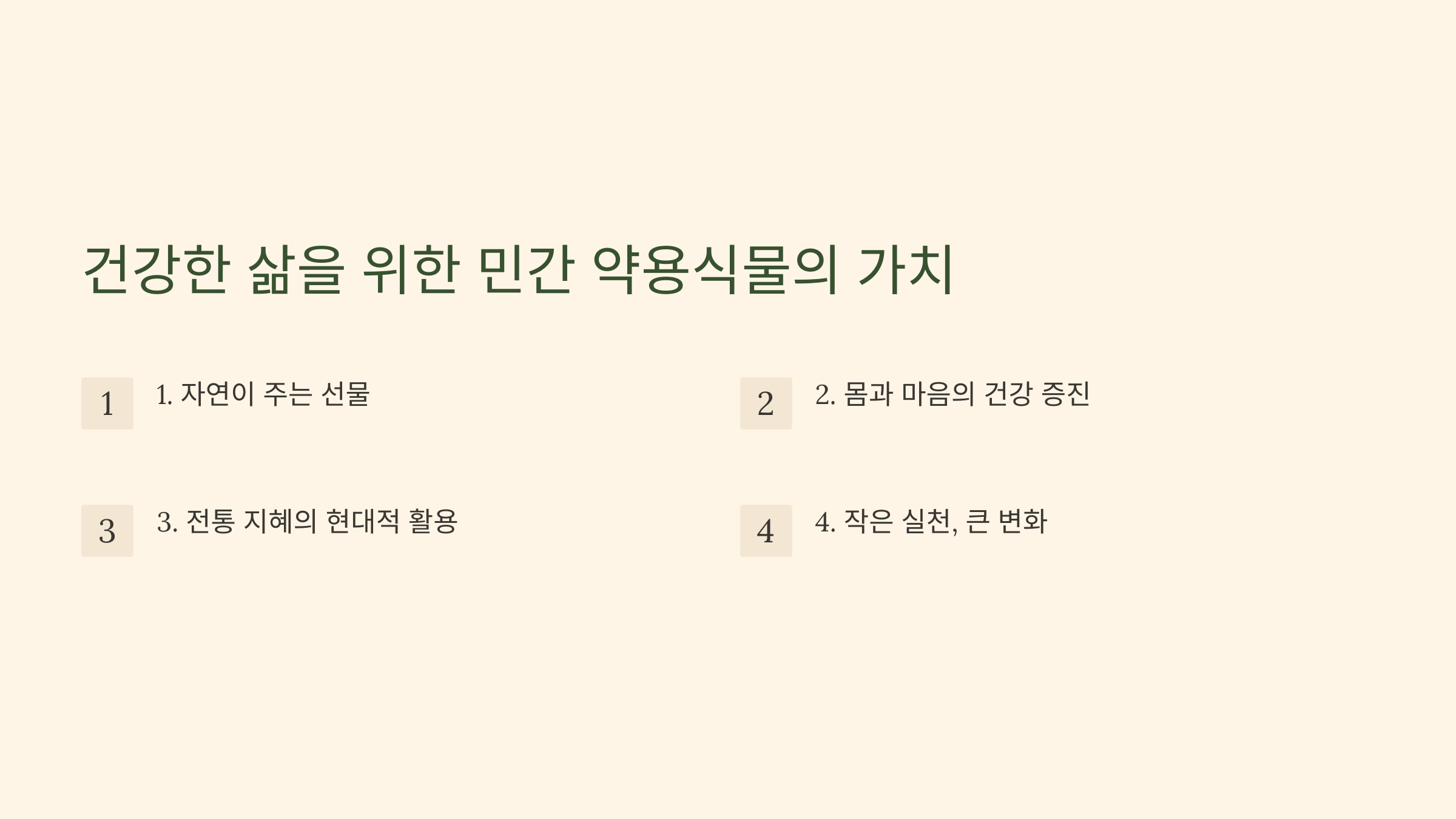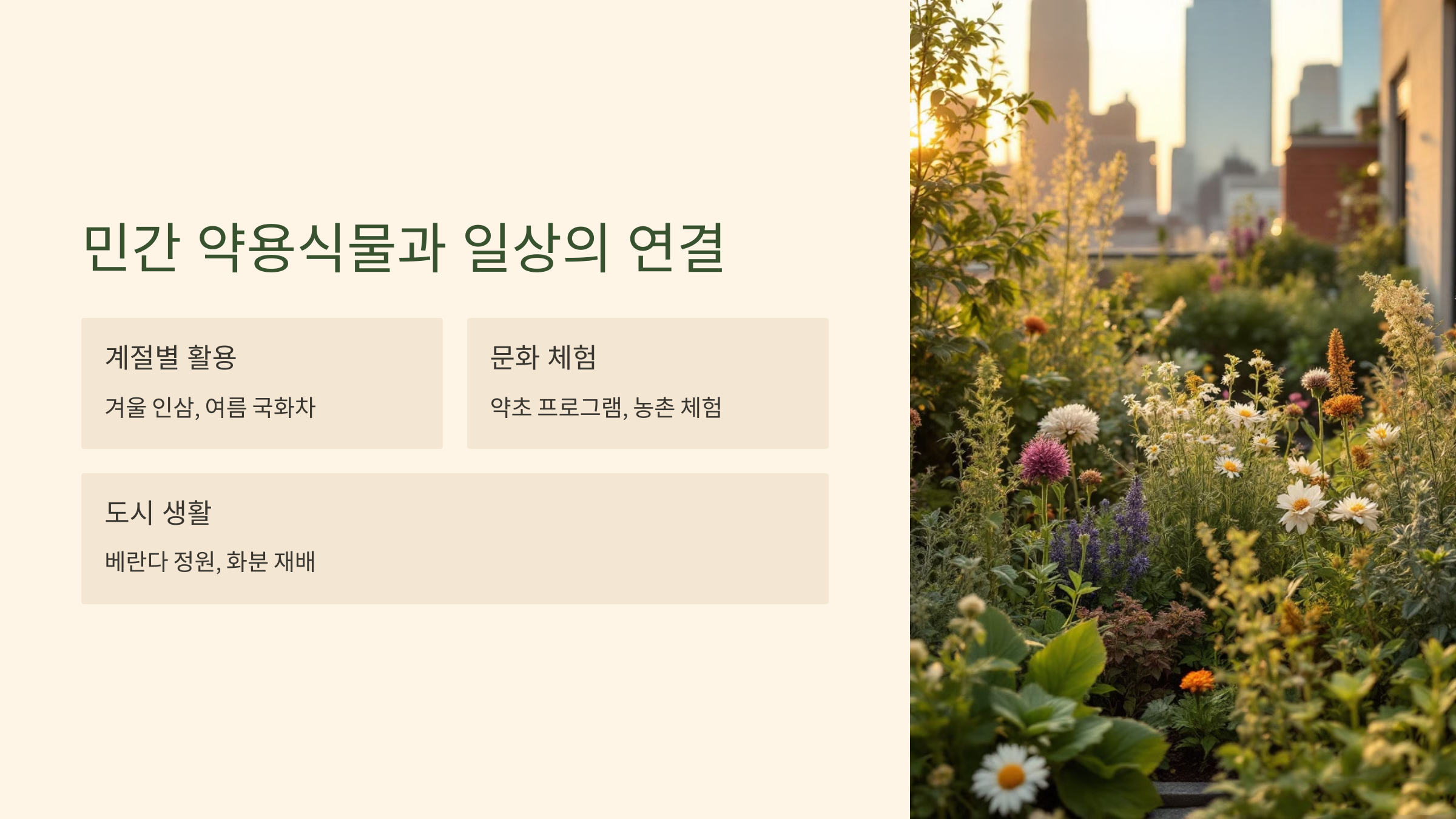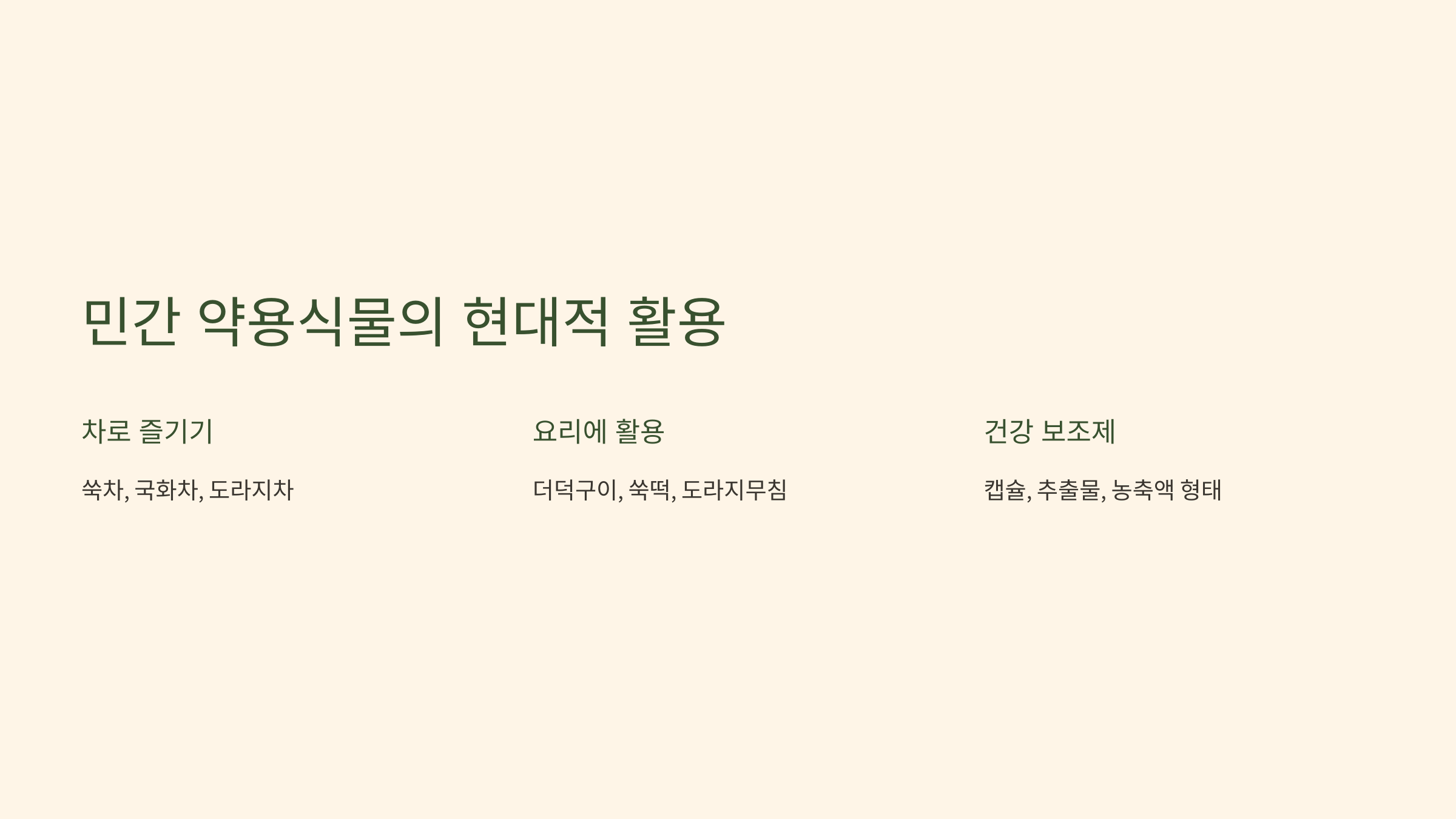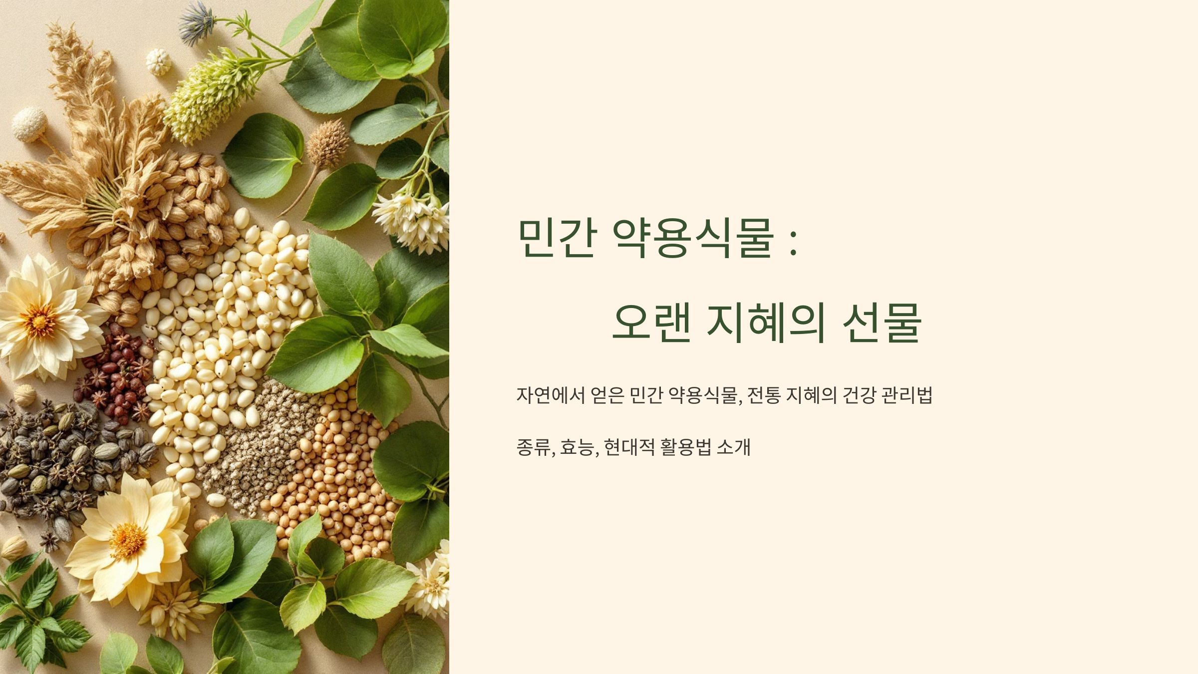 민간 약용식물은 자연이 준 선물로, 우리의 몸과 마음을 건강하게 만들어 줍니다. 오랜 세월 동안 이어져 온 지혜를 현대적으로 활용하여 건강한 삶을 만들어 보세요. 작은 실천으로도 큰 변화를 느낄 수 있을 것입니다.