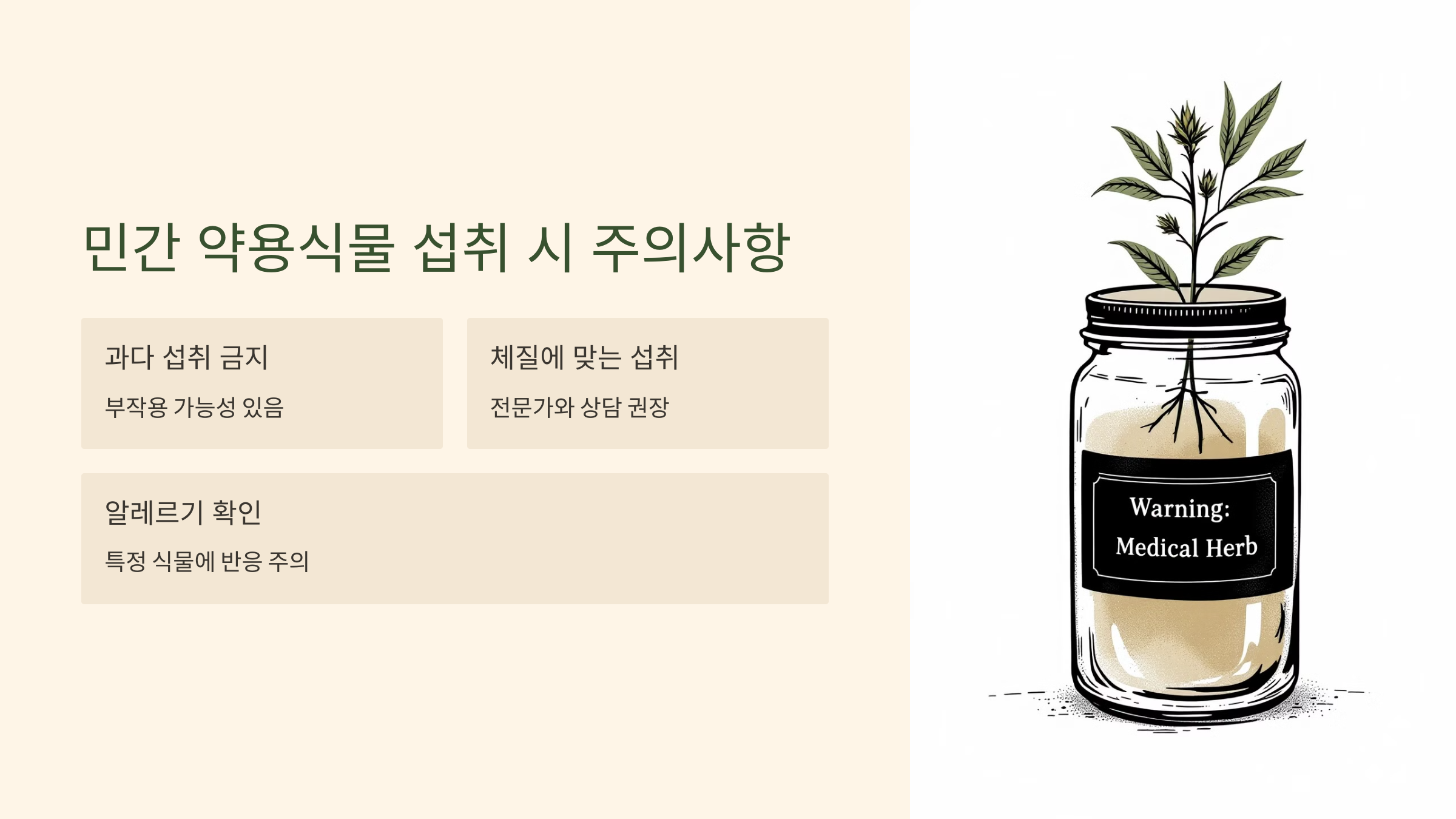 - 알레르기 확인: 특정 약용식물에 알레르기 반응이 있을 수 있으니 주의가 필요합니다.