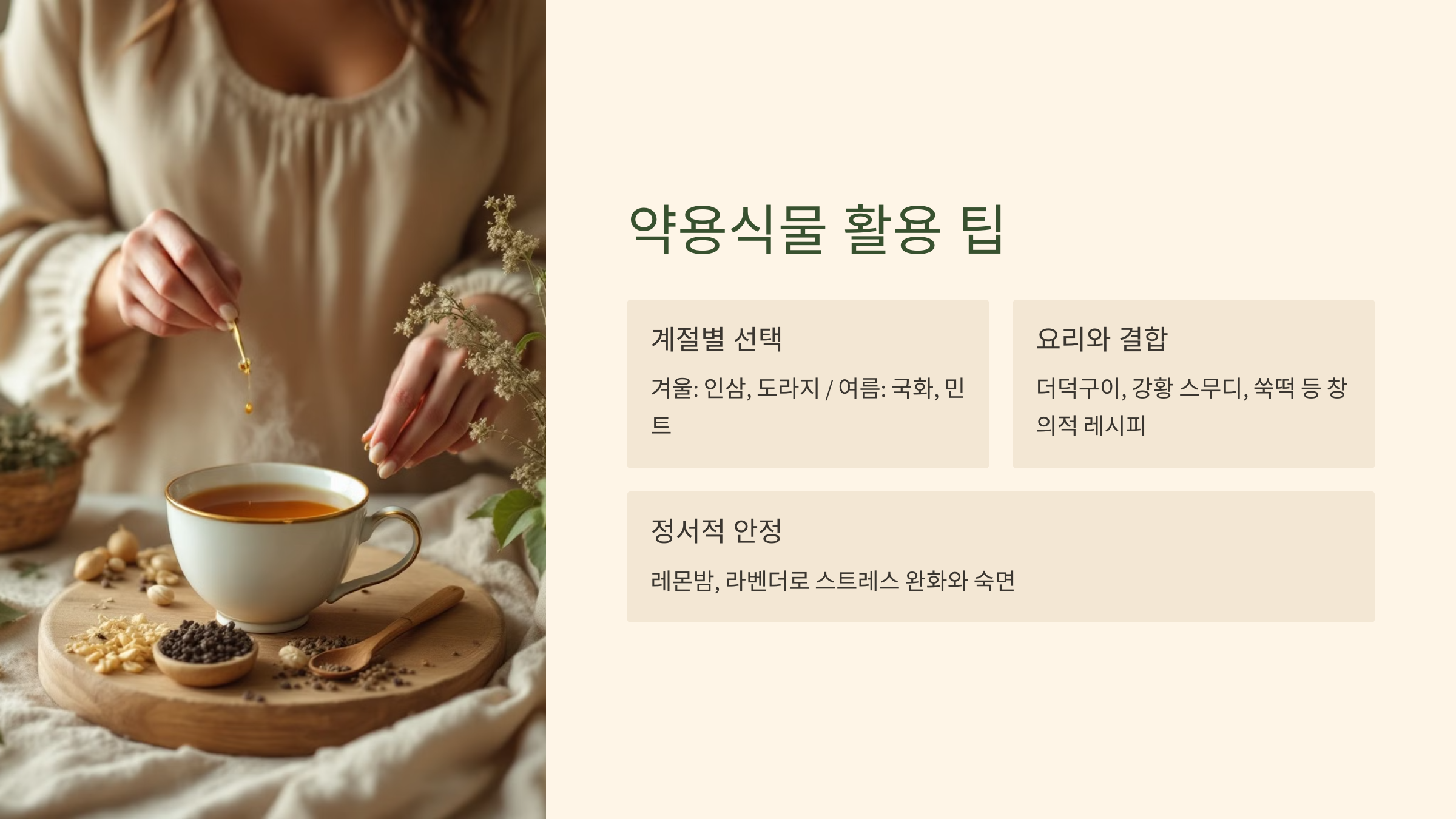 계절에 따라 건강에 적합한 약용식물을 선택하세요. 겨울에는 인삼과 도라지, 여름에는 국화와 민트가 적합합니다.