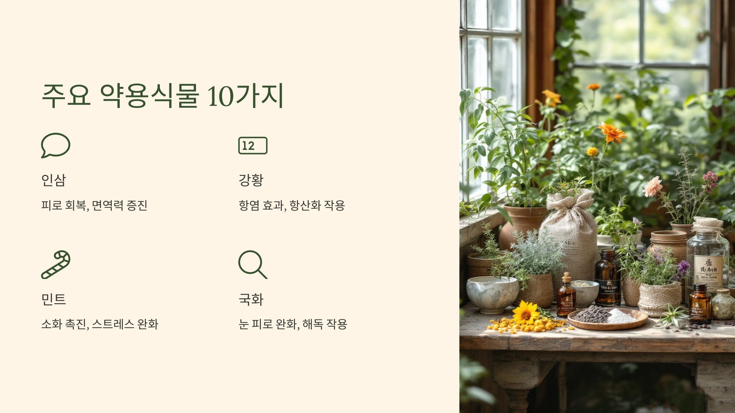자연은 우리에게 다양한 건강 자원을 제공합니다. 약용식물은 그중에서도 몸과 마음을 치유하고 질병을 예방하는 데 탁월한 효과를 발휘하는 자연의 선물입니다. 이번 글에서는 건강에 좋은 약용식물 10가지를 소개하고, 그 효능과 활용법에 대해 알아보겠습니다.