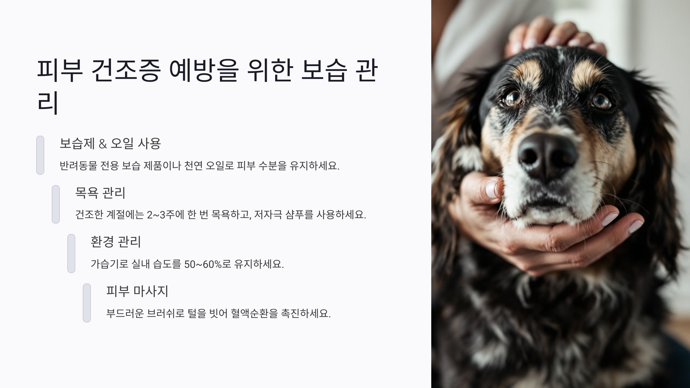 반려동물의 피부 건강을 유지하려면 보습과 영양 관리를 꾸준히 해주는 것이 중요해요.
