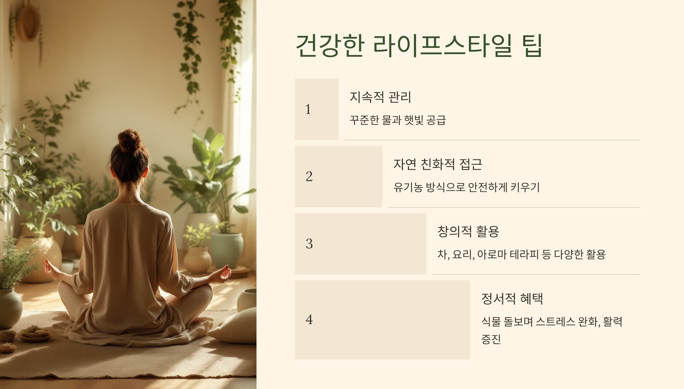 - 정서적 혜택: 식물을 돌보는 일은 스트레스를 완화하고 일상에 활력을 줄 수 있습니다.